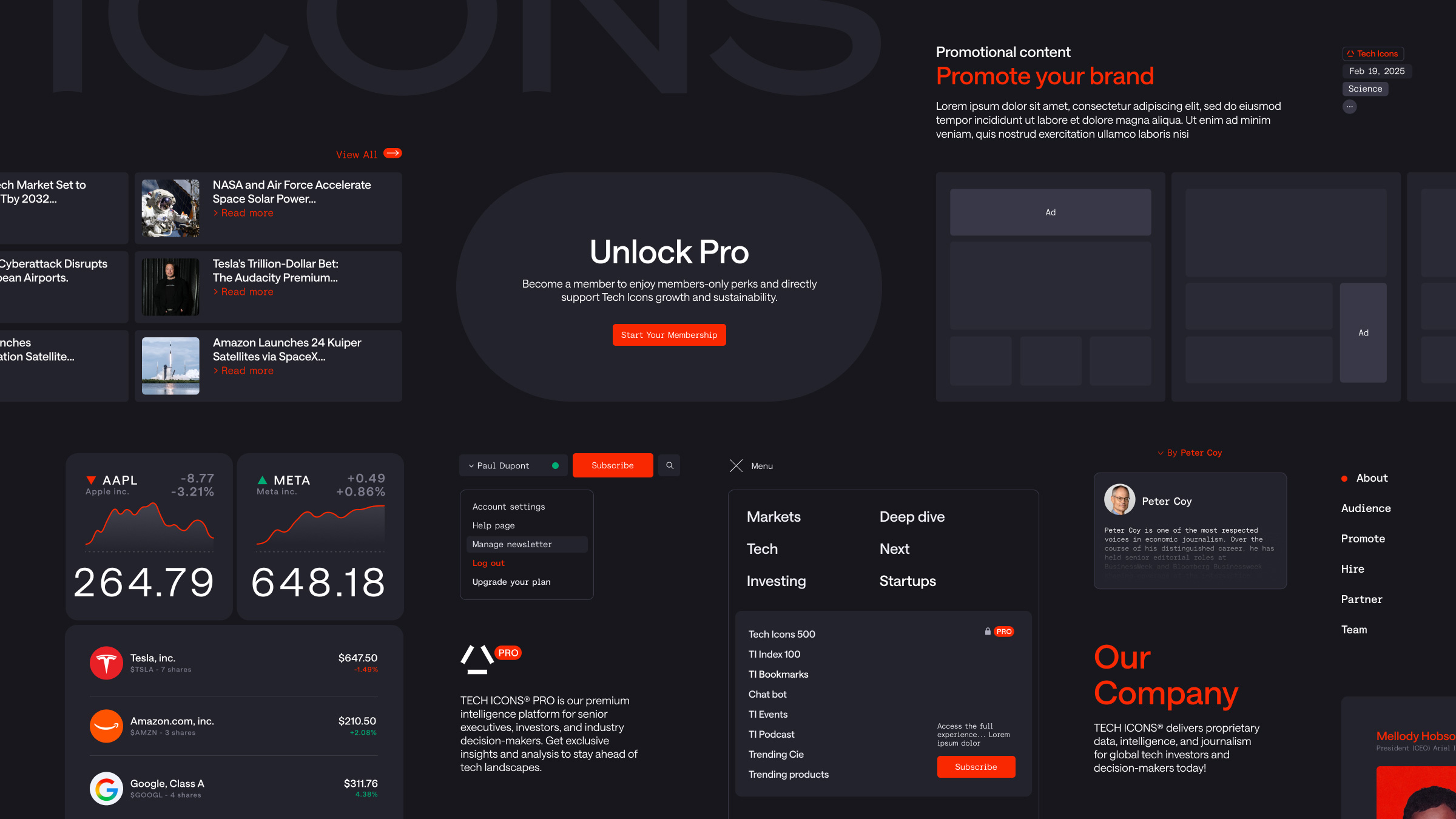 Tech Icons is a London-based strategic media platform that analyzes technology news for investors, founders, and industry leaders. In an ecosystem saturated with information, the platform aims to offer a clear and structured perspective on the transformations shaping the industry. The mandate was to design an identity capable of positioning Tech Icons as a credible and contemporary reference in technology media. The approach needed to inspire trust while maintaining a strong aesthetic appeal, avoiding the cold and stereotypical codes often associated with the tech sector. The visual system also had to support a content-rich editorial platform capable of hosting a large volume of articles and analysis.